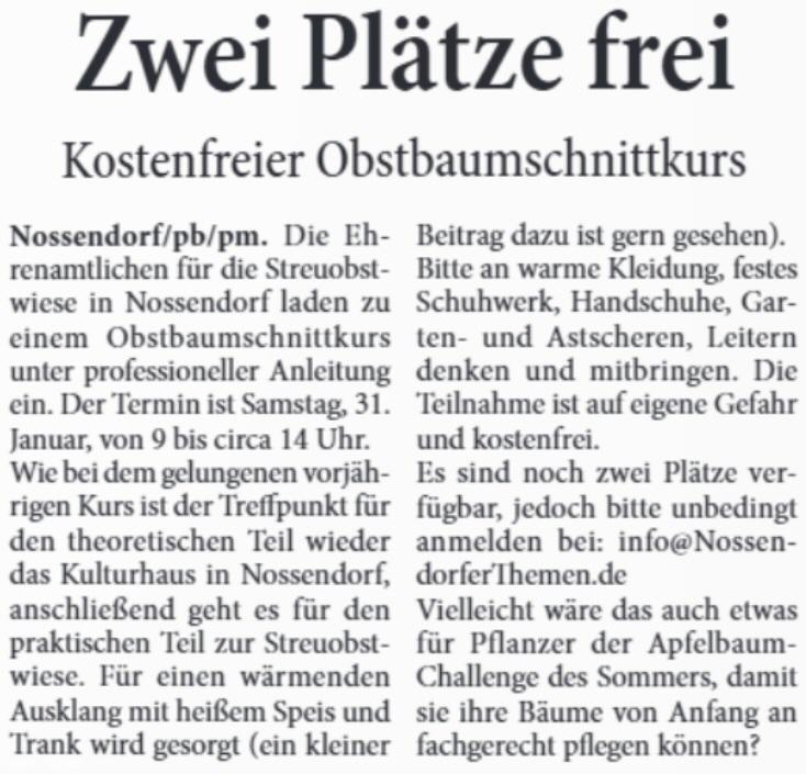 Es sind noch zwei Plätze verfügbar, jedoch bitte unbedingt anmelden bei: info@NossendorferThemen.de !