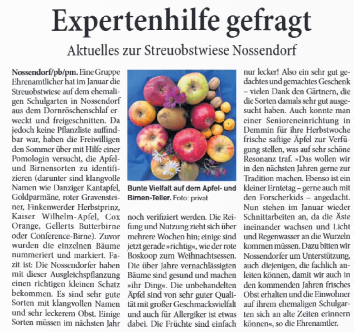 Dazu bitten wir Nossendorfer um Unterstützung, auch diejenigen, die fachlich anleiten können, damit wir auch in den kommenden Jahren frisches Obst erhalten und die Einwohner auf ihrem ehemaligen Schulgarten sich an alte Zeiten erinnern können.