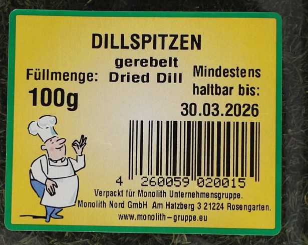 |  Bildquelle © Wurdies Kräuter GmbH & Co.KG Verpackungseinheit: 40 Gramm sowie ein Vertrieb als lose Kilo-Ware Chargennummer / Los-Kennzeichnung: M-15251 (lose Kilo-Ware) Grund der Meldung: Fremdkörper Haltbarkeit: Mindeshaltbarkeit (MHD): 18.01.2027 Hersteller / Inverkehrbringer: Wurdies Kräuter GmbH & Co.KG,