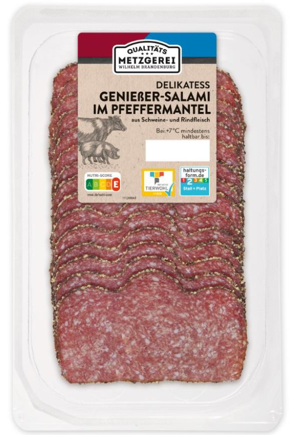 | Genießer Salami im Pfeffermantel der Marke "Qualitätsmetzgerei Wilhelm Brandenburg", 80 Gramm |